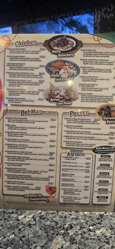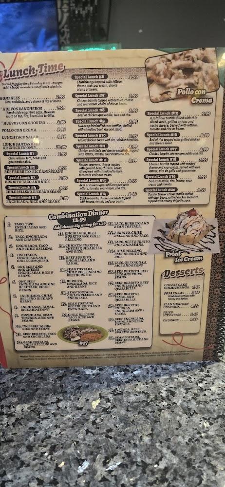 Prices typically fit tightly into the $10 to $20 range. Noteworthy dishes include Pollo Con Crema and Chicken Fajita Burritos, both popular among diners. The margaritas are equally famed, complementing your meal perfectly. Desserts, like the Cheese Cake Chimichanga, offer a sweet finish to any meal. Overall, the menu has something for everyone, creating a memorable experience with every visit.